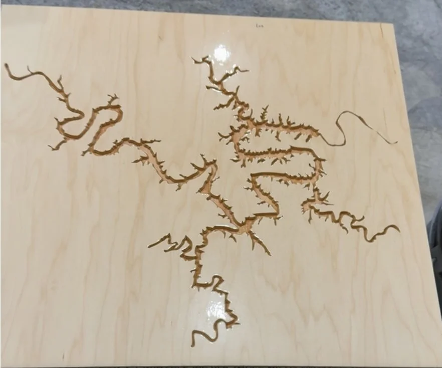 Once we have an approved design, it is time for us to go to work creating your truly one-of-a-kind piece. We use some of the best materials and equipment we can get our hands on to create our maps! Our lakes are carved using our industrial CNC machine which gives us the ability to have the precision needed to showcase the beauty of your lake’s shoreline accurately.